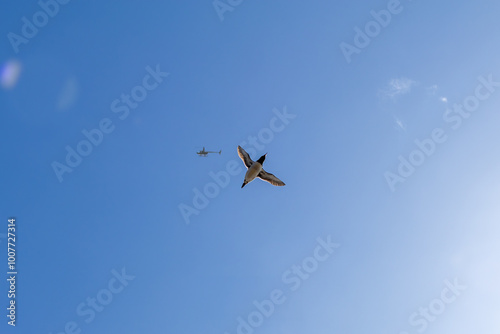 sky, aeroplane, plane, flying, fly, flight, aircraft, jet, air, bird, cloud, travel, transportation, aeroplane, aviation, cloud, bird, wing, transport, blue, fighter, military, helicopter, nature, clear, tour, view, below, belly