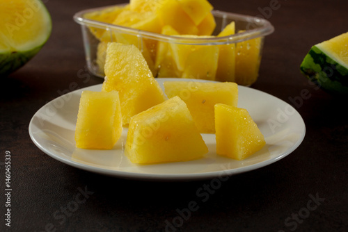 A view of a plate of chopped yellow watermelon chunks.