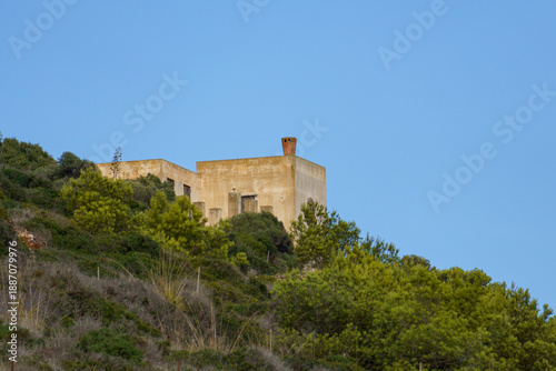 A view of a solitary, earth-toned building perched on a hillcrest, set against a clear blue sky and surrounded by dense Mediterranean scrub and pine trees, symbolizing remote island living and escape.