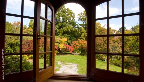 autumn, garden, tree, leaf, window, door, wood, nature, colours, view, landscape, fall, green, sky, bright, sunlight, colourful, vibrant, scenery, peaceful, tranquil, picturesque, arch, double, pane, glasses, wooden, grass, foliage, maple, shrub, stone, path, beautiful, creative, modern, elegant, stylish, professional, decorative, stunning, amazing, marvellously, fantastic, gorgeous