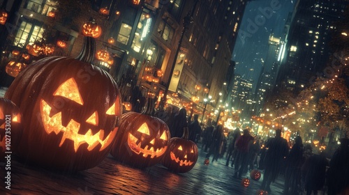 A view of glowing jack-o'-lanterns on a busy city street, with people celebrating Halloween in the background.