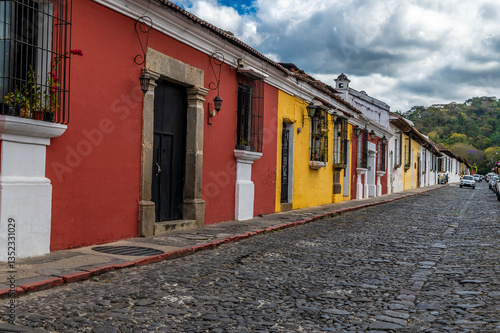 A view up a colourful, cobbled street in Antigua in Guatemala in early springtime