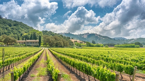 A vineyard tour in Napa Valley, with rows of grapevines, elegant tasting rooms, and a view of the rolling hills