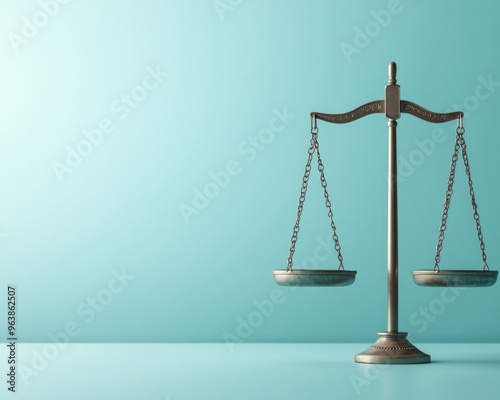 A vintage balance scale stands elegantly against a soothing turquoise background, symbolizing justice and equality.