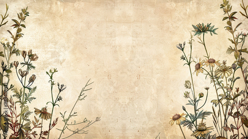 A vintage botanical illustration background featuring detailed drawings of flowers and plants on a parchment-like backdrop, offering a nostalgic and elegant style