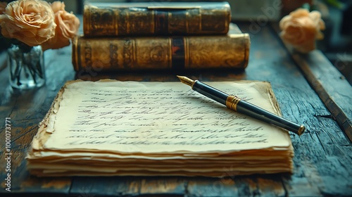 A vintage fountain pen rests on an open journal with a handwritten message on aged paper, alongside antique books and delicate roses.