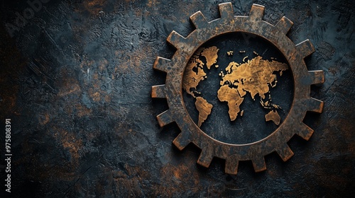 A vintage-style world map encased in a metallic gear symbolizing global industry, innovation, and mechanical progress on a textured background.