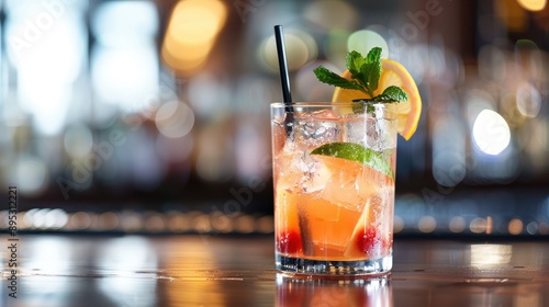 A visually appealing cocktail glass filled with mixed fruits and mint leaves, garnished with lemon and strawberries, at a bar with a blurry, bokeh backdrop suggesting a vibrant scene.