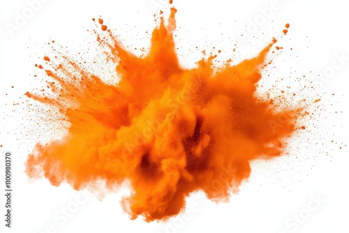 A vivid burst of orange powder dispersing dynamically with visible particle details