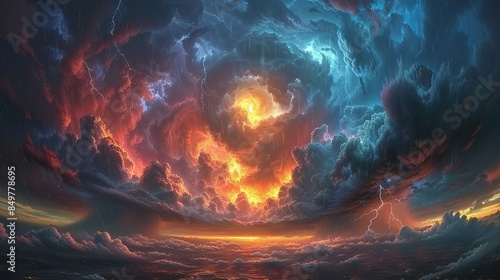 high-coloured, image, sky, tumult, dark, swirling, storm, cloud, bright, flash, lightning, heavy, rain, falling, sheet, colourful, rainbow, beginning, form, duality, anger, beauty, nature, dramatic, illustration, photo