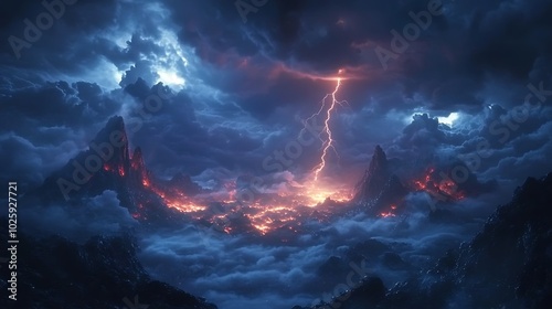 A vivid nighttime scene of cloud-to-ground lightning striking a hilltop, with the bolt’s light spreading across the landscape and illuminating the surrounding clouds.