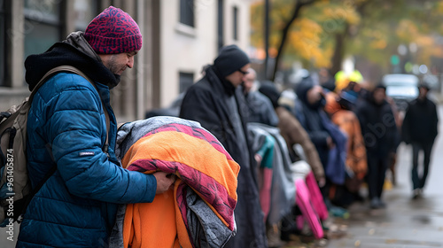 volunteer, blanket, homeless, compassion, community, support, charity, cold, kindness, autumn, assistance, people, caring, social issue, warmth, empathy, shelter, help, poverty, giving, hope, city, street, donation, relief, humanity, diversity, nature, human relationships, teamwork, togetherness, welfare, service, activism, generosity, aid, resource, urban, sharing, neighbourhood