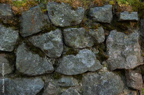 a wall of rough granite stones, with moss in the cracks