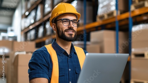 A warehouse worker in a hard hat and glasses smiles while using a laptop, surrounded by stacked boxes and shelves.
