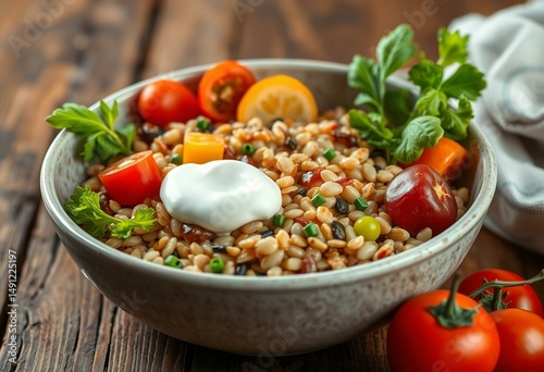A warm and inviting grain bowl with fresh vegetables and a dollop of yogurt, set against a rustic wooden background
