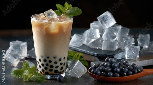 A warm beverage sits next to a bowl of fresh blueberries and mint leaves, creating a cozy kitchen atmosphere with a silver pot