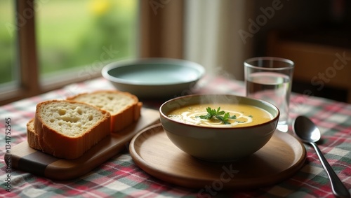 A warm bowl of creamy soup garnished with fresh herbs, paired with slices of bread, sits on a rustic wooden board against a checkered tablecloth near a window