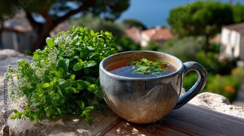 A warm cup of herbal tea is served with fresh mint leaves, highlighting the natural, aromatic essence of this soothing beverage. The tranquil countryside adds to the relaxing atmosphere