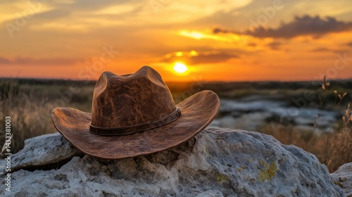 leather, hat, cowboy, sunset, sky, orange, sun, light, gold, dusk, stone, rock, texture, worn, rustic, country, western, nature, field, landscape, horizon, cloud, grass, background, wild, scenic, rural, detail, rimmed, crown, material, element, outdoors, wilderness, tranquil, calm, warm, season, dramatic, evening, silhouette, shape, object, stillness, rest, quiet