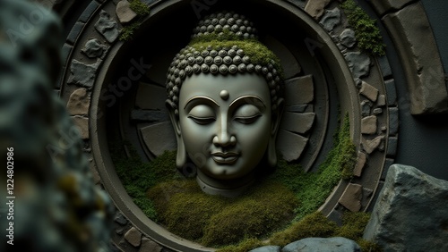 A weathered Buddha face emerges from a temple wall, moss gently covering its carved lines, hinting at ancient serenity.