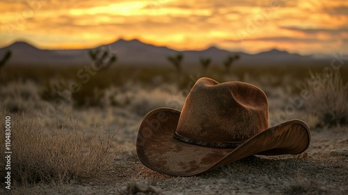 hat, cowboy, sunset, landscape, desert, nature, sky, horizon, rustic, silhouette, brown, solitude, calmness, adventure, travel, wild, rugged, scenic, dusk, evening, exploration, culture, fashion, heritage, relaxation, warmth, earth, environment, beauty, iconic, vintage, western, freedom, craftsmanship, style, tradition, journey, photo, terrain, wilderness, shadow, sun, atmosphere, calm, aesthetic