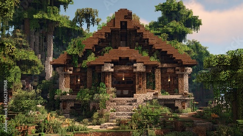 house, building, jungle, forest, wood, stone, overgrown, rustic, weathered, aged, temple, hut, cabin, stair, step, entrance, doorway, pillar, column, roof, gable, vegetation, plant, leaf, tree, greenery, architecture, design, nature, landscape, scene, image, digital, art, game, pixel, block, textured, detailed, shadow, light, sun, day, ambience, atmosphere, serene, peaceful, calmness, mossy