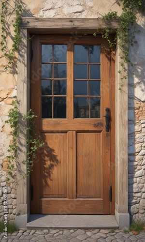 A weathered wooden door with a window and vines , natural, entrance, wood