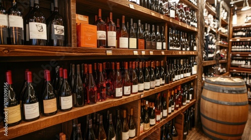 A well-organized display of various bottles of wine on wooden shelves in a wine store, offering a variety of choices in an elegant setting.