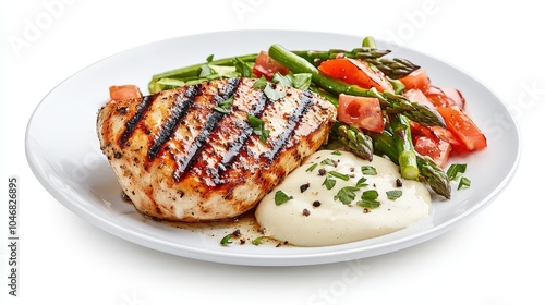 A well-plated entre featuring grilled chicken, asparagus, and a light sauce, carefully displayed on a white plate with a white background.