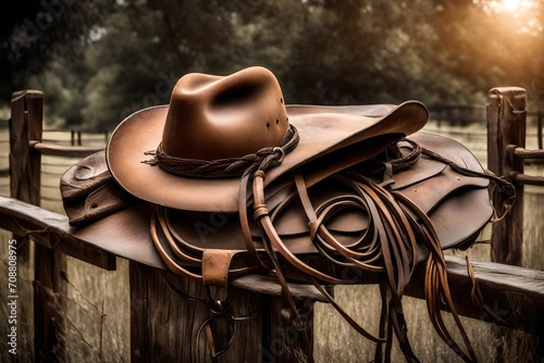 A well-worn leather saddle placed on a wooden fence, accompanied by a coiled lasso and a weathered cowboy hat.
