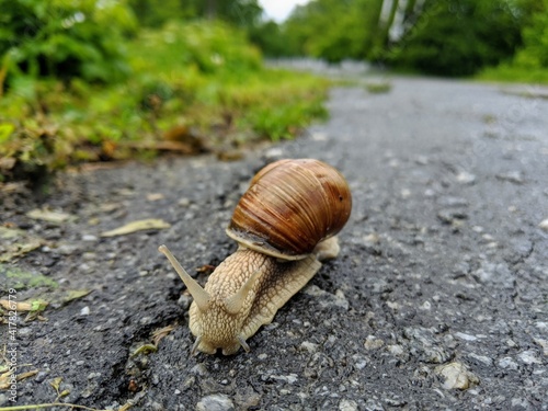 A wet snail crawls along a black, worn road