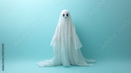 A whimsical ghost figure draped in white fabric, set against a soft turquoise background, exuding a playful and friendly vibe