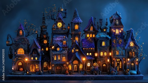 A whimsical halloween village with illuminated windows and spooky architectural details at night time