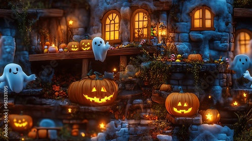 haunted, house, whimsical, bright, smiling, window, glowing, lantern, porch, ghost, waving, candy, pumpkin, star, fun, playful, halloween, night, hd, natural, look, magical, cosy