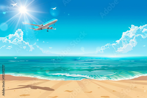 white, aeroplane, flying, beautiful, blue, ocean, sky, sunny, sea, clear, summer, calm, peaceful, travel, serene, soaring, beach, water, high, vacation, air, sand, plane, tropics, flight, aircraft, nature, landscape, holiday, coast, tour tourism, background, view, transportation, landing, aviation, relax, island, sun, trip, wave, passenger, jet, destination, airline, commercial, cloud, phuket, aerodrome