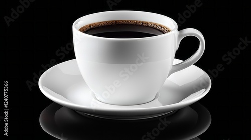 A white ceramic cup sits elegantly on a matching saucer, filled with rich black coffee