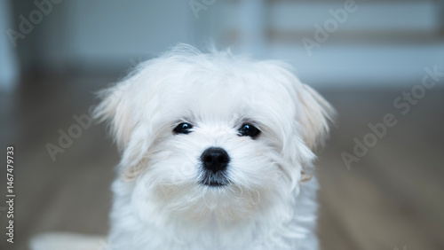 A white Maltese puppy stares quietly with gentle, soulful eyes, expressing a sense of innocence, longing, and vulnerability in a calm indoor environment.