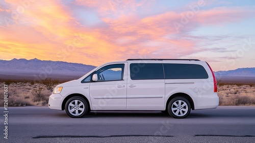 van, sunset, road, landscape, desert, vehicle, travel, nature, sky, cloud, mountain, horizon, transportation, scenery, adventure, journey, freedom, exploration, asphalt, wheel, profile, peaceful, calm, dusk, colours, scenic, empty, huge, open, tranquil, drive, highway, terrain, modern, design, family, leisure, utility, roomy, comfort, mobility, lifestyle, summer, warmth, relaxation