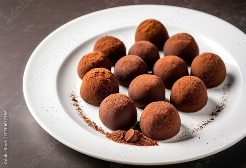 chocolate, truffle, on, a, white, plate, with, cocoa, powder, scattered, around, them, set, against, dark, textured, background, the
