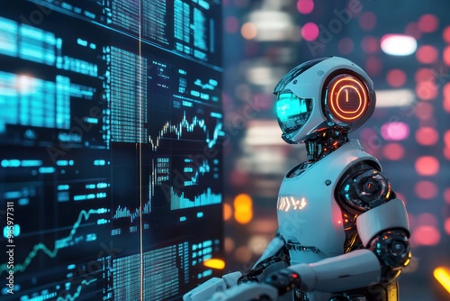 robot, white, screen, datum, analysis, financial, chart, number, futuristic, technology, artificial, intelligence, ai, machine, learning, automation, digital, information, cyberspace, network, interface, program, code, software, hardware, display, monitor, glowing, light, modern, abstract, design, concept