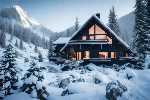 A white-roofed wooden house in the mountains covered with snow - AI Generative