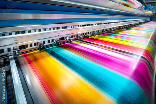 A wide-format printer produces stunning color prints on vibrant paper, capturing the essence of modern printing with a smooth and dynamic movement