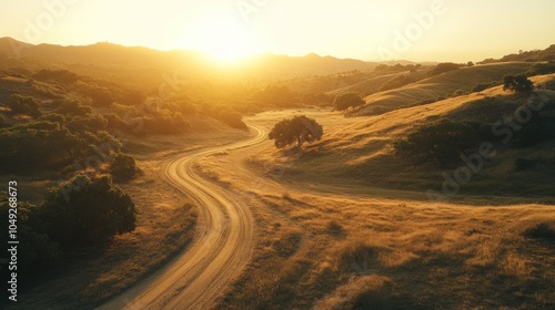 A winding dirt road leads through a golden landscape at sunset, with rolling hills and a lone tree in the distance.