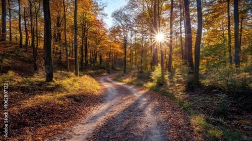 A winding dirt road through a forest, bathed in the golden light of the setting sun. The trees are ablaze with autumn colors, creating a breathtakingly beautiful scene.
