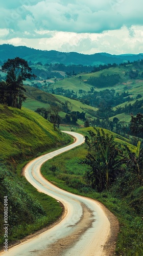 A winding road through lush green hills, surrounded by vibrant forests and stunning mountains, perfect for nature lovers and adventurers.