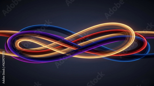 A winding rope of light forms an endless knot (infinity), combining blue, purple, red, and orange, creating a sense of abstraction, energy, and flow