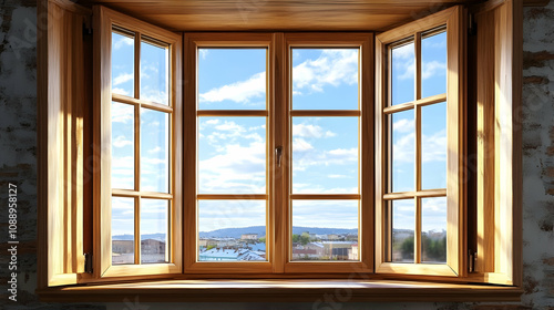 A Window with a View of the City Skyline and Clouds, Framed by a Wooden Windowsill, Light Streaming In, Sunlight Through the Window