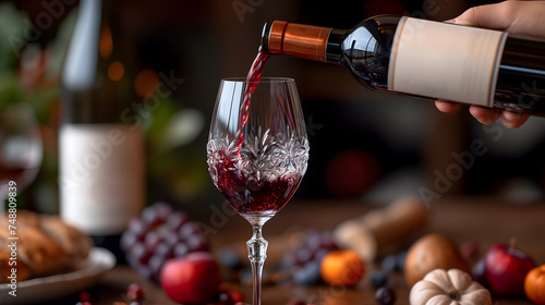 A wine bottle, with its elegant shape and deep red liquid inside, is being poured into a crystal glass, ready to be enjoyed during a romantic dinner. Neural network generated image. Not based on any