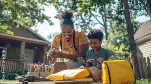 woman, boy, table, neighbourhood, sunny, day, item, sale, outdoors, house, tree, toy, craft, smiling, happy, together, family, summer, selling, buying, fence, grass, yellow, backpack, artwork, cardboard, box, sitting, fun, activity