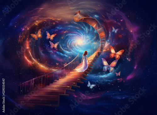 A woman ascends a staircase towards a swirling, bright light portal against a cosmic background filled with stars and galaxies, accompanied by butterflies.